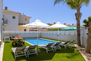 The air-conditioned villa consists of 4 bedrooms, a living room, a fully equipped kitchen with a dishwasher and a coffee machine, and 3 bathrooms with a bath and a hair dryer. Towels and bed linen are featured in the villa. The property has an outdoor dining area.